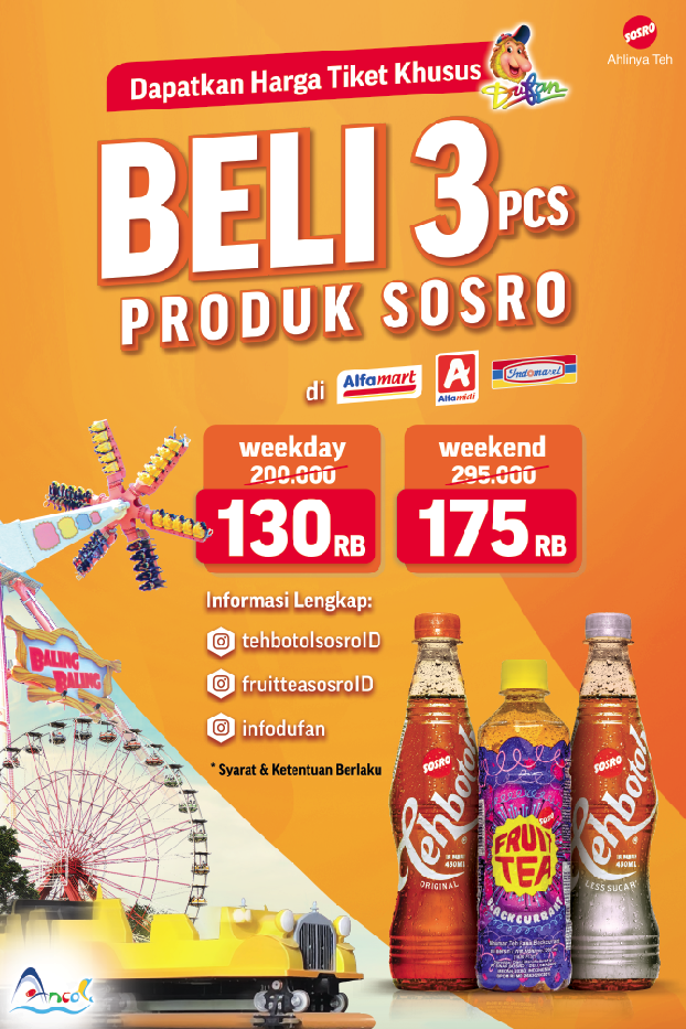 Dapatkan harga tiket khusus Dufan di Taman Impian Jaya Ancol dengan membeli 3pcs Tehbotol Sosro 450 ml / Fruit Tea Sosro 500 ml.